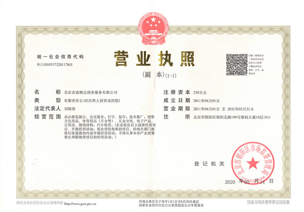 北京首選順達商務服務有限公司 一 營業(yè)執(zhí)照